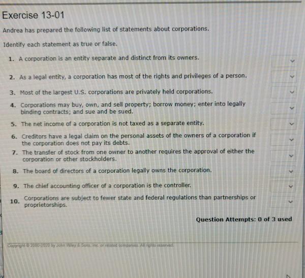 Andrea has prepared the following list of statements about corporations. Select an option FalseTrue 2. Andrea has prepared the following list of statements about corporations.